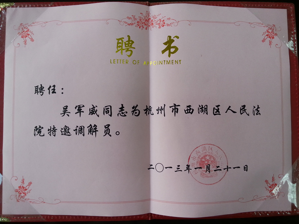 [京衡网讯]2013年1月24日,杭州市西湖区法院举行特邀调解员聘任仪式,京衡律师吴军威、最美妈妈吴菊萍等来自律师、心理咨询师、注册会计师、房产中介等多个行业共计56人被聘任为特邀调解员。 据统计,2012年杭州西湖区法院一共收案1.5万件,比2011年多了整整4000件。年人均办案达到274件。这个数据是全国法官年人均办案数的3.5倍,浙江省的1.8倍。因此2012年9月,西湖区法院委托钱江晚报帮忙招募特邀调解员。招募令一出,共来了200多位的报名者。经过精挑细选,第一批56人被聘任为杭州市西湖区法院的特邀调解员。 聘任仪式的当日,共有18位特邀调解员受理委托调解案件26起,已结案12件,其中7件调解成功,还有3件基本成功。在这些调解员中,有5位调解员是受理委托调解案件两件以上的。 特邀调解员所参与的是诉前调解,诉前调解的意义就在于节约司法资源,让法官把更多心思花到疑难和重大案件上。诉前调解尤其适合目前大量增加的借贷纠纷、物业纠纷、工伤赔偿纠纷等案件。京衡律师吴军威也将发挥自身的专业优势,积极介入各类诉前调解工作,充分履行京衡的社会责任。