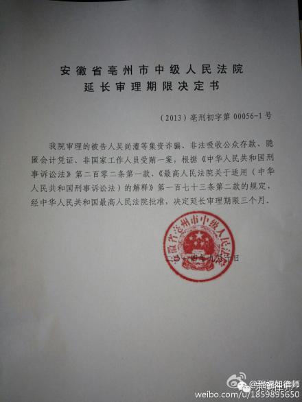 本案的司法程序已持续数年,原由亳州市检察院于2010年1月6日提起公诉,指控亳州市兴邦科技开发有限公司原董事长吴尚澧等39名被告人犯集资诈骗、非法吸收公众存款、隐匿会计凭证、非国家工作人员受贿罪。2011年3月15日,亳州中院作出一审判决,判处吴尚澧死刑,其余被告人死缓、无期、有期徒刑等刑罚。吴尚澧等人不服,上诉至安徽省高级人民法院。安徽高院维持了吴尚澧的死刑判决,并报请最高人民法院核准,最高法院撤销一、二审判决,将案件发回安徽高院重审,安徽高院又将案件发回亳州中院重审。